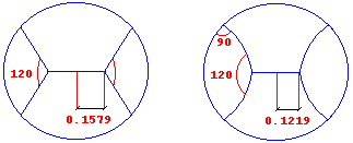 Esta división se ha obtenido recordando la conocida propiedad de que el punto situado en el interior de un triángulo cuya suma de distancias a los tres vértices es mínima es el que ve estos bajo ángulos de 120 grados. Sin embargo, todavía puede mejorarse: intuitivamente se comprende que, al no ser los segmentos rectos incidentes sobre la circunferencia perpendiculares a ésta podrían ser sustituídos por arcos de circunferencia que cumplieran con esta condición. Se mejora todavía algo, llegando a la figura de la derecha donde L=3,9412.